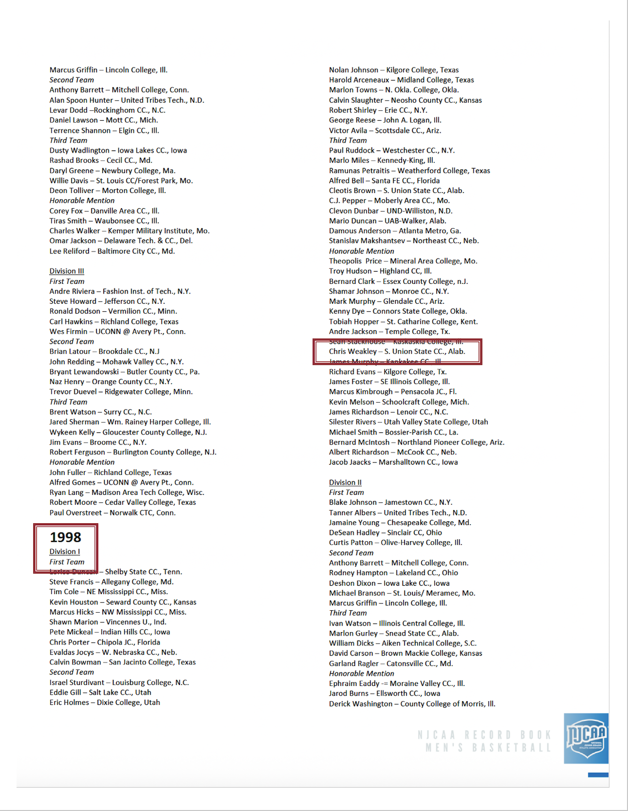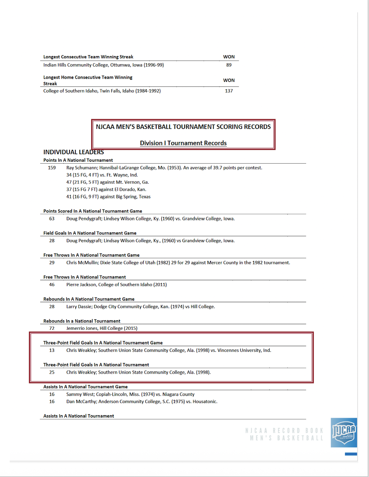 Christopher Weakley still holds NJCAA Basketball Records set in 1998 for 3-point field goals made in a national tournament game and in a national tournament. He was also named NJCAA Division I First Team All-American in 1998 honoring his exceptional statistics, leadership and athletic performance.